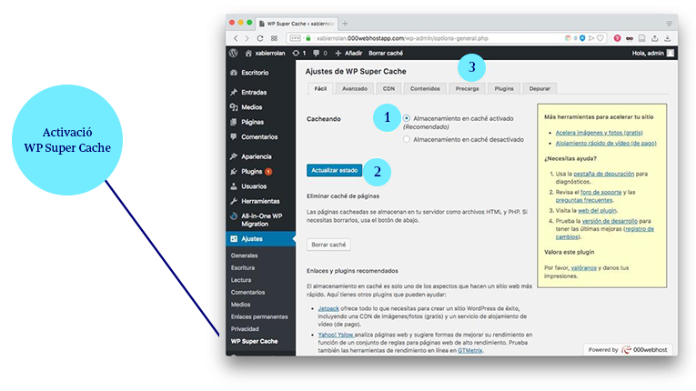 Aquest complement és molt senzill i fàcil de configurar. Després d’instal·lar el complement, aneu a «Ajustos > WP Super Cache» i, en la primera pestanya, activeu la memòria cau (1) i guardeu la configuració (2). A partir d’aquest moment la velocitat de càrrega millorarà.
