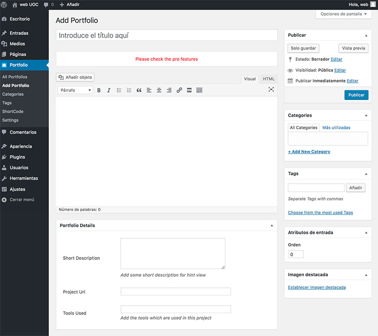 Ahora sí, vamos a crear elementos en el porfolio. Dirígete a «Portfolio > Add portfolio» para abrir un nuevo editor e insertar los datos relativos a tu trabajo. Deberías cubrir los siguientes datos:
